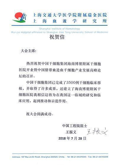 图说:中国工程院院士、中国干细胞集团首席科学家、上海血液学研究所名誉所长王振义院士发来了贺信 |