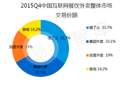 在易观发布的《2015H2中国互联网餐饮外卖市场专题研究报告》显示,2015年第四季度,饿了么、美团外卖、百度外卖分别以33.7%、33.1%和19%的市场份额排在前三位。而到了今天外卖行业的座次已经发生变化。据Trustdata刚刚发布的《2018年上半年中国移动互联网行业发展分析报告》显示,2018年上半年,美团外卖、饿了么和百度外卖的交易额占比分别为59%、36%和3%,外卖市场正逐渐形成“631”格局。