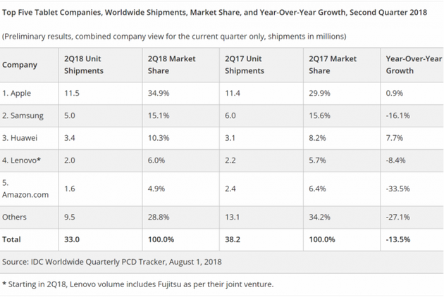 据外媒Softpedia报道,IDC公布的新统计数据显示,今年第二季度全球平板电脑继续呈现下滑趋势,这一季度全球平板电脑出货量为3300万,同比下滑13.5%。其中可拆卸式平板的出货量有所下降,而普通平板的出货量为2840万台,再次大幅下降14.5%。