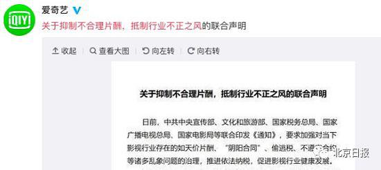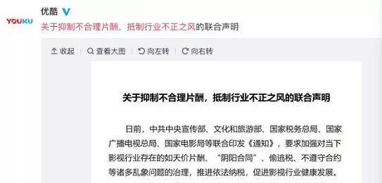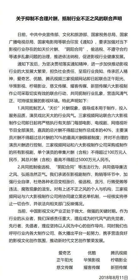 今天上午9时,爱奇艺、优酷、腾讯视频、正午阳光、华策影视(9.330,-0.11, -1.17%)、柠萌影业、慈文传媒(13.110, 0.46, 3.64%)、耀客传媒、新丽传媒发布《关于抑制不合理片酬,抵制行业不正之风的联合声明 》。
