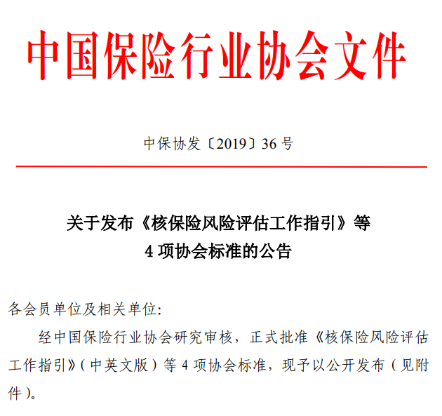 6月26日,中国保险行业协会发布《核保险风险评估工作指引》(中英文版)及《企业财产保险公估作业规范》《机器损坏保险公估作业规范》和《建筑工程(一切)险公估作业规范》四项保险业协会标准。