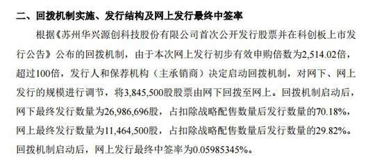 6月27日华兴源创晚间公告显示,网上发行初步中签率为0.039777%,回拨机制启动后,网上发行最终中签率为0.05985345%。