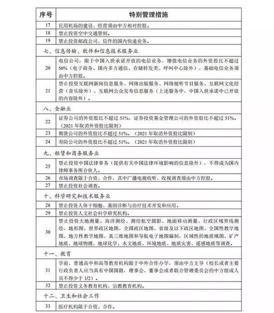 一是推进服务业扩大对外开放。交通运输领域,取消国内船舶代理须由中方控股的限制。基础设施领域,取消50万人口以上城市燃气、热力管网须由中方控股的限制。文化领域,取消电影院、演出经纪机构须由中方控股的限制。增值电信领域,取消国内多方通信、存储转发、呼叫中心3项业务对外资的限制。