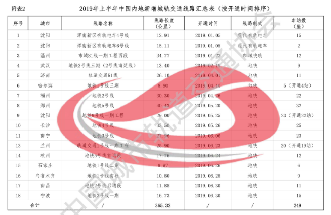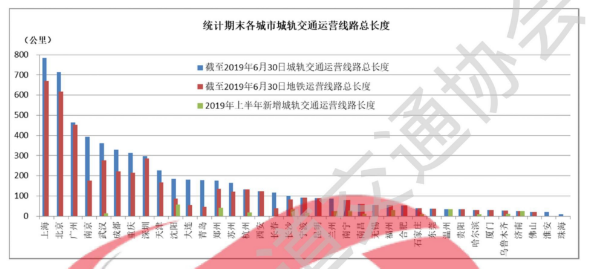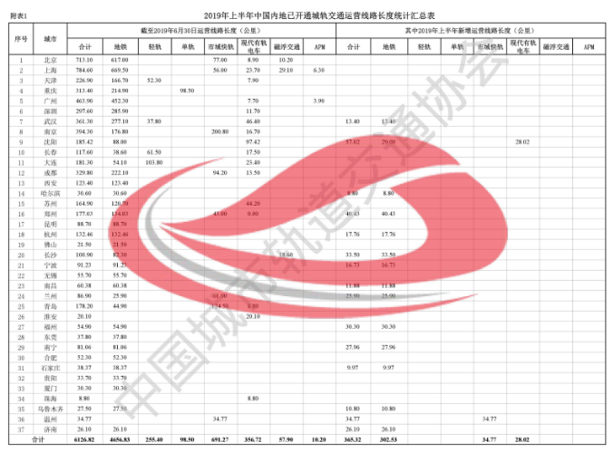 根据中国城市轨道交通协会7月1日发布的数据显示,到2019年上半年,中国内地累计有37个城市投运城轨交通线路6126.82公里。