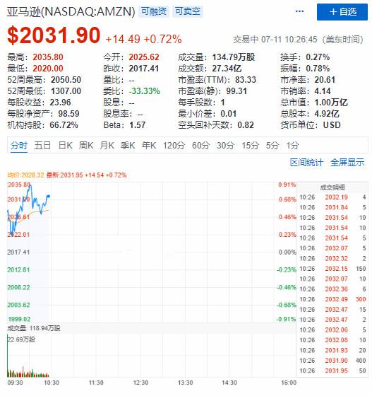 7月11日,亚马逊盘中市值重返万亿美元,为去年10月以来首次,仅次于微软。截至发稿,亚马逊报2031.90美元,涨0.72%,总市值1.00万亿美元。微软涨0.42%,总市值1.06万亿美元,为全球市值最高的公司。苹果涨0.22%,总市值9369.75亿美元。