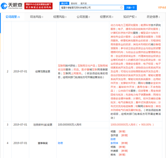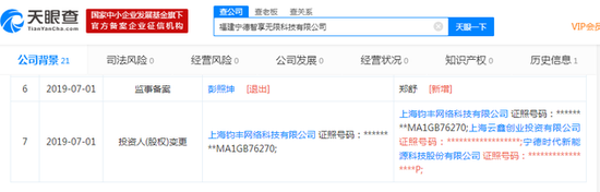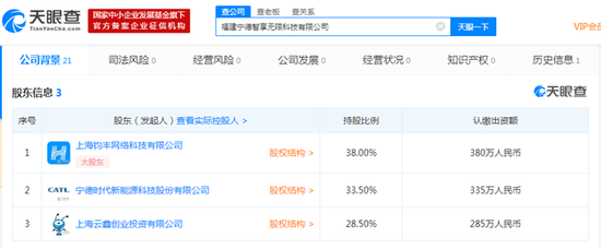 新浪科技讯 7月15日上午消息,天眼查数据显示,7月1日,福建宁德智享无限科技有限公司发生工商变更,新增股东蚂蚁金服旗下上海云鑫创业投资有限公司,持股28.5%;宁德时代新能源科技股份有限公司,持股33.5%,原股东上海钧丰网络科技有限公司为最大股东,持股38%。同时该公司注册资本增加900万人民币。