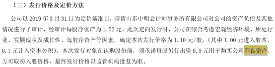 值得注意的是,这个定向发行有一个重要条件:“在认购股份前,须承诺每股另行出资0.9元用于购买不良资产。”