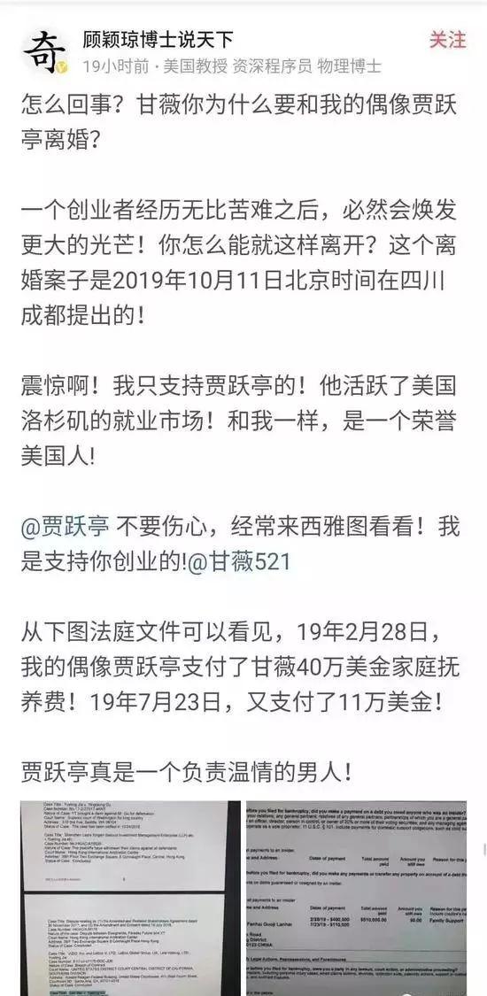 19日晚间,与贾跃亭有诉讼历史的顾颖琼再次曝出大料。曝光的法庭文件显示,2019年10月11日贾跃亭和甘薇已经在成都锦江区人民法院申请离婚,状态是处理中。