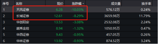 巨量解禁压顶带来的压力仍在继续。在昨日因超百亿天量解禁致股价一字跌停之后,天风证券(6.280, -0.70, -10.03%)今日股价仍被牢牢钉在跌停板上,这已经是其连续两天股价出现跌停。不仅仅是天风证券,另一次新股长城证券(12.780, -0.97, -7.05%)将在下周迎来解禁,而且解禁的市值更是远超天风证券,在今日券商股表现中,长城证券股价跌幅仅次于天风证券,截至收盘,长城证券股价报收12.61元/股,跌幅高达8.29%。