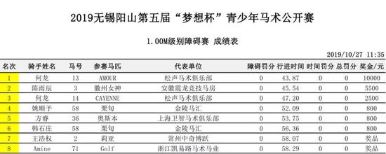 在1.00M级别障碍赛中,冠军依然是来自上海松声马术俱乐部的骑手何龙,本场比赛他策骑的马匹是“AMOUR ”,斩获10000元的冠军奖金。