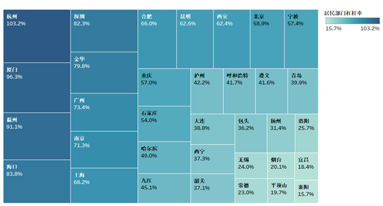 杭州是第一个杠杆率超过100%的城市,这也就意味着杭州的居民贷款超过了本城一年的GDP,这其中蕴含着较大的金融风险。“在我国,杠杆率高的城市有一个重要特点,‘三高’——即房价比较高,外地人买房的比例较高,买房的投资性需求较高。”刘磊对记者说,“这也说明居民杠杆率与房地产的高度相关性。”