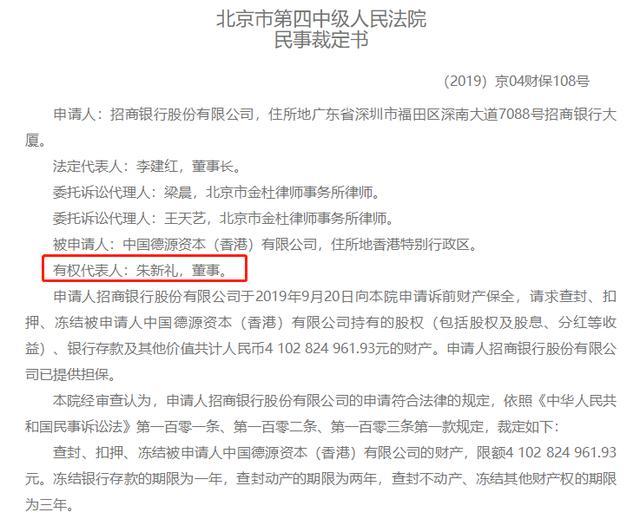近日,中国德源资本(香港)有限公司因金融借款合同纠纷被招商银行(36.370, 0.25, 0.69%)起诉。据一份民事裁定书,招商银行曾向法院申请诉前财产保全,请求查封、扣押、冻结德源资本持有股权等资产约计41亿元。该裁定中,汇源集团创始人朱新礼作为德源资本董事成为有权代理人。