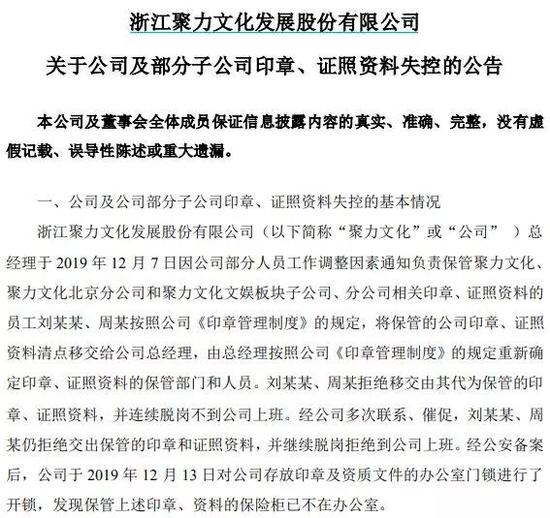 公告称,12月13日,聚力文化经公安备案后,对公司存放印章及资质文件的办公室门锁进行了开锁,发现保管上述印章、资料的保险柜已不在办公室。