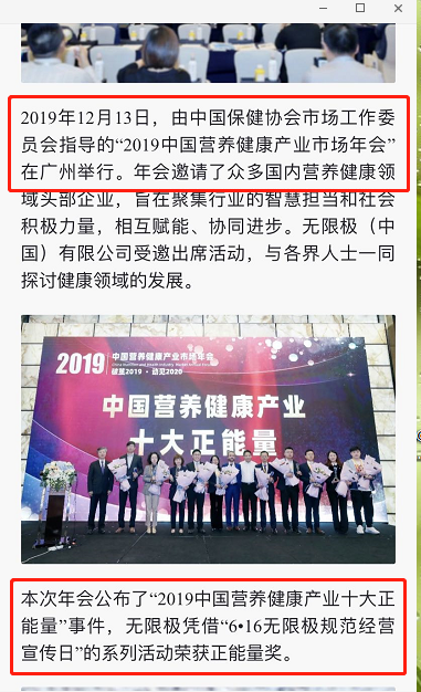 文章说:会上公布了“2019中国营养健康产业十大正能量”事件,无限极凭借“6•16无限极规范经营宣传日”的系列活动荣获正能量奖项!