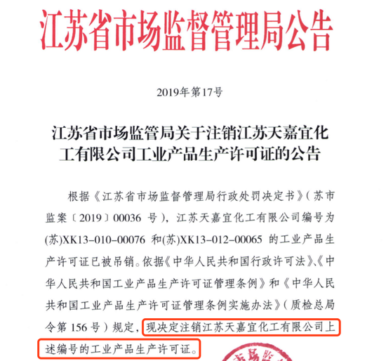 江苏省市场监督管理局下发的公告文件,天嘉宜化工被吊销工业产品生产许可证。 受访者供图