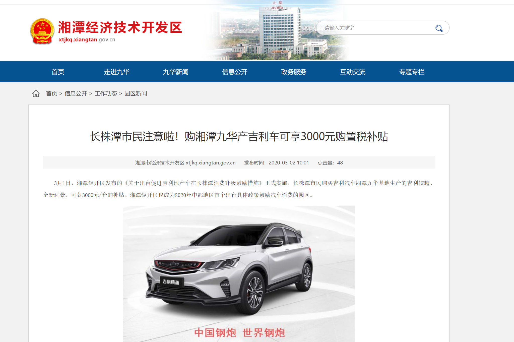 3月2日,湘潭经济技术开发区官网发布的《关于出台促进吉利地产车在长株潭消费升级鼓励措施》文件显示,长沙、株州、湘潭市民购买吉利汽车湘潭九华基地生产的吉利缤越、全新远景,可获3000元/辆的补贴,该政策自3月1日起正式实施。