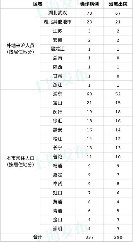 截至3月1日24时,上海市已累计排除疑似病例2427例,发现确诊病例337例。确诊病例中,男性175例,女性162例;年龄最大88岁,最小7月龄;145例有湖北居住或旅行史,34例有湖北以外地区居住或旅行史,158例有相关病例接触史;外地来沪人员111例,本市常住人口226例。具体情况如下: