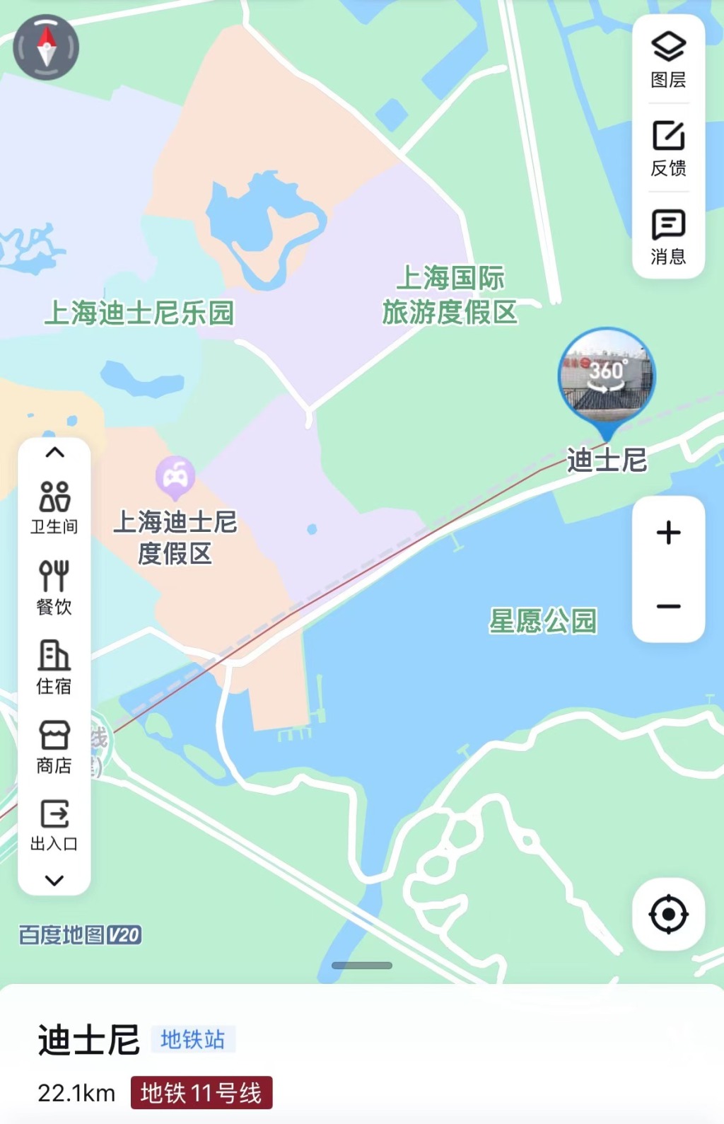 地图软件上显示,上海地铁11号线迪士尼站位于迪士尼度假区中心景观湖北侧,距离迪士尼较近。 截屏图 |
