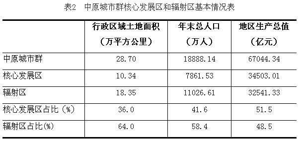 以上14个核心发展区城市2017年行政区域土地面积为10.34万平方公里,年末户籍人口为7861.53万人,地区生产总值为34503.01亿元,分别占中原城市群的36.0%、41.6%和51.5%,以上16个辐射区城市2017年土地面积为18.35万平方公里,年末户籍人口11026.61万人,地区生产总值为32541.33亿元,分别占中原城市群的64.0%、58.4%和48.5%。核心发展区以占比较少的人口和土地,创造出占比较多的价值。