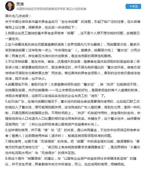 新浪财经讯 今日午间,中国财政学会副会长、前财政部财政科学研究所所长、华夏新供给经济学研究院首席经济学家贾康在互联网平台回应称,关于中国社保体系中基本养老金实行“全社会统筹”的话题,引起了较广泛的注意,但从网上议论看,误解很多。