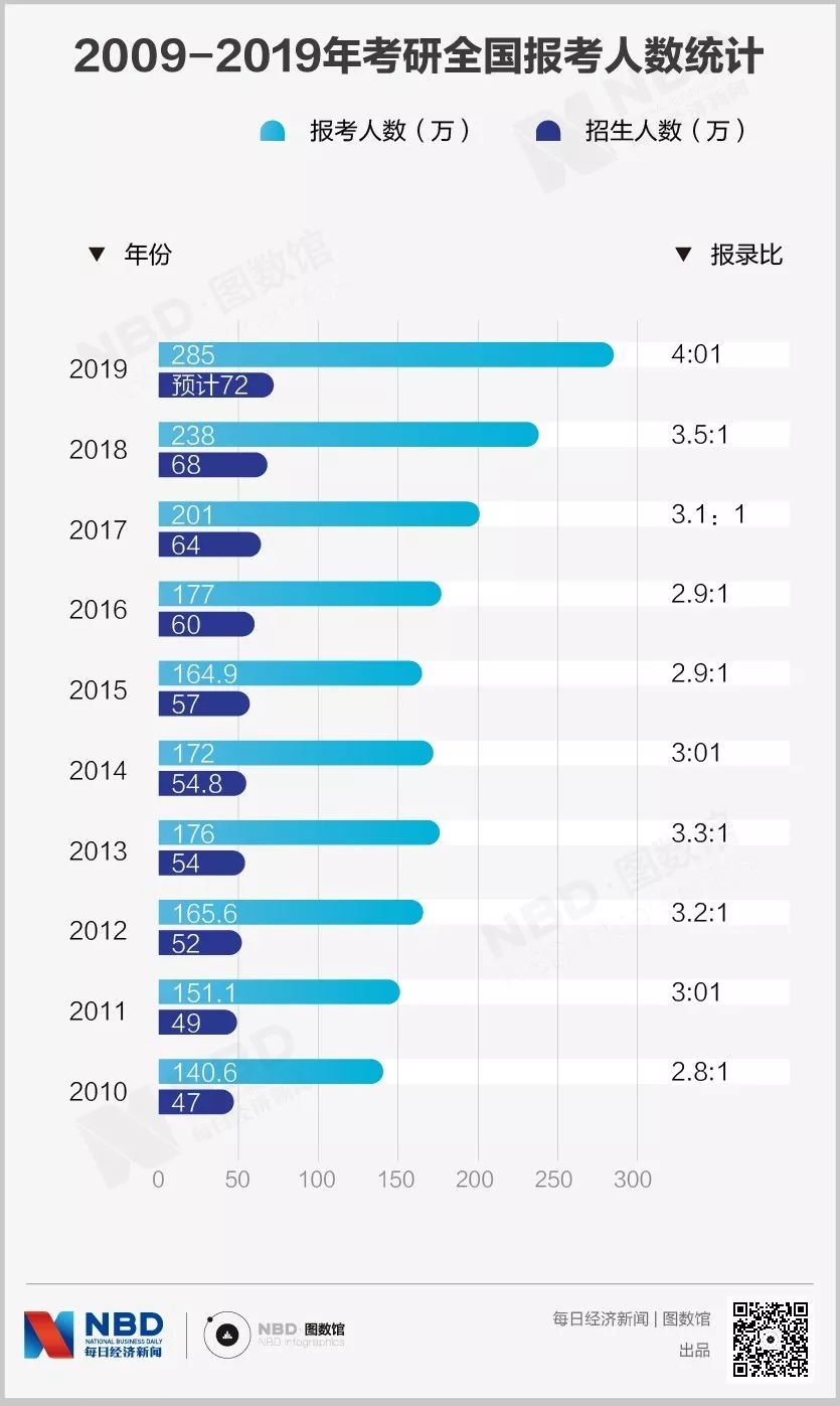 从报录比来看,2010年为2.8:1,2019年则为4:1,对比十年数据,研究生规模增大,但竞争也同样有所加大。