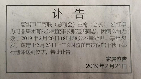 浙江卓力电器集团已于2月21日发出讣告:2月20日18时58分,53岁的慈溪市工商联(总商会)主席(会长),浙江卓力电器集团有限公司董事长张建杰因病医治无效在慈溪市周巷镇家中不幸去世。