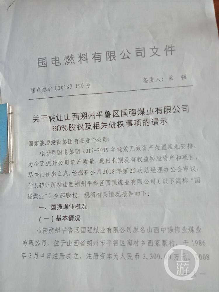 上游新闻获得的国电燃财(2018)190号文件显示,根据原国电集团2017-2019年低效无效资产处置规划安排,为全面提升公司资产质量,退出长期没有收益控股资产和项目,尽快止住出血点,经公司2018年第25次总经理办公会议审议,计划转让国强煤业全部股权。