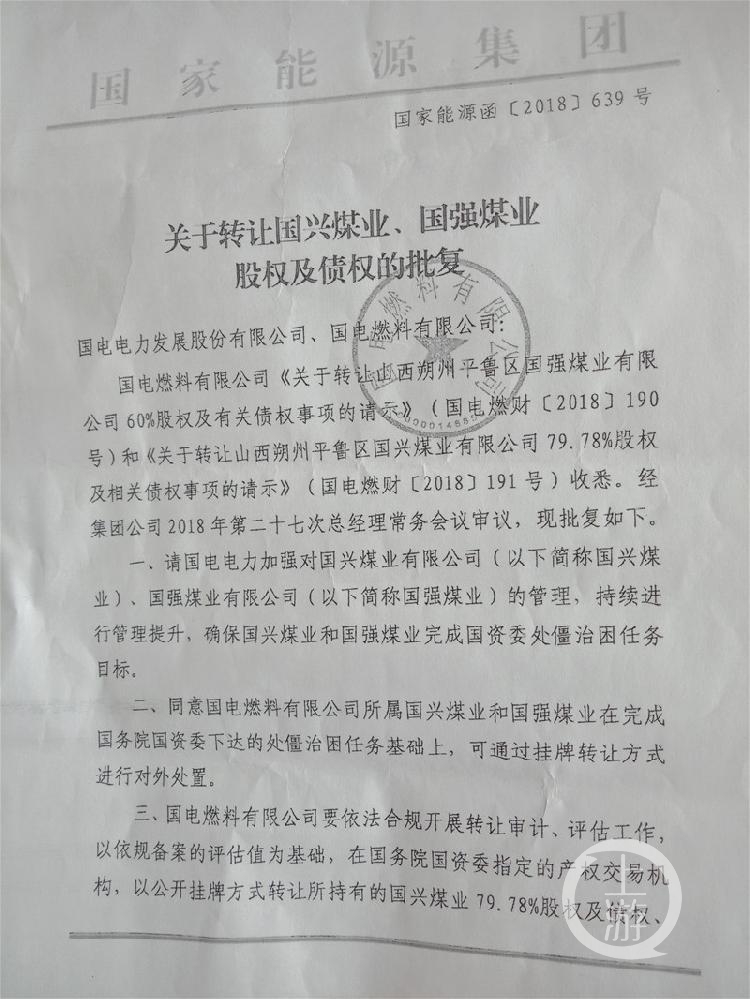 国家能源集团对国电燃料公司关于转让国强煤业股权及债权的批复文件。摄影/上游新闻记者 牛泰