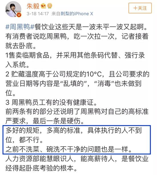 中国农业大学食品科学与营养工程学院副教授朱毅在微博上表示:周黑鸭员工有的没有健康证是硬伤;多好的规矩,多高的标准,具体执行的人不到位,都不行。