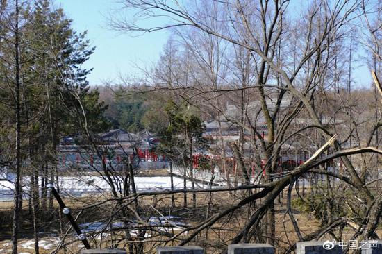 朱红色大门紧锁,没有开放的痕迹。站在汽车顶上,透过茂密的树林,隐约能看到里面的建筑群。高高低低的建筑,全部是仿古样式。围墙的一角,还专门建设了岗楼。