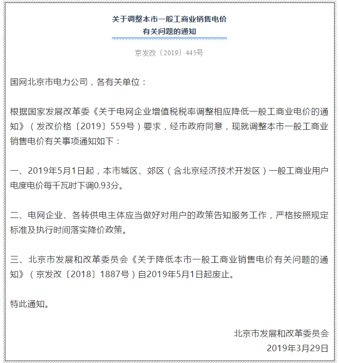 新京报快讯 据北京市发改委微信公号消息,为贯彻落实《政府工作报告》关于一般工商业电价再降低10%的要求,北京市按照国家电价调整的统一部署,自2019年5月1日起,利用增值税税率调整资金空间,降低本市一般工商业用户目录电价和输配电价,每千瓦时降低0.93分。电价调整后,全年可降低一般工商业用户电费负担4.69亿元。