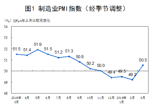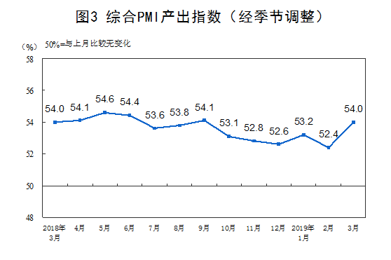 国家统计局发布的数据显示,2019年3月份,中国制造业采购经理指数、中国非制造业商务活动指数、中国综合PMI产出指数均创下近半年来新高。
