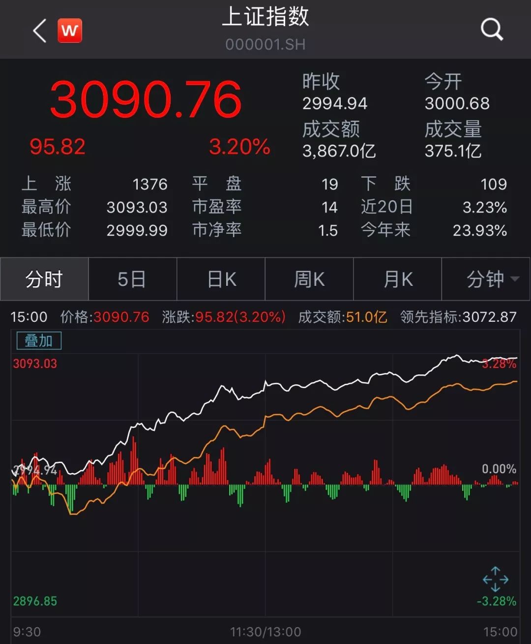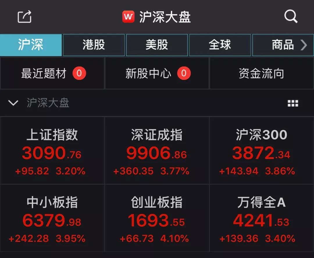 午后大盘企稳,出现普涨行情。截至收盘,上证指数暴涨100点至3090.76,涨幅超3%;上证50、沪深300指数均涨逾3.8%。