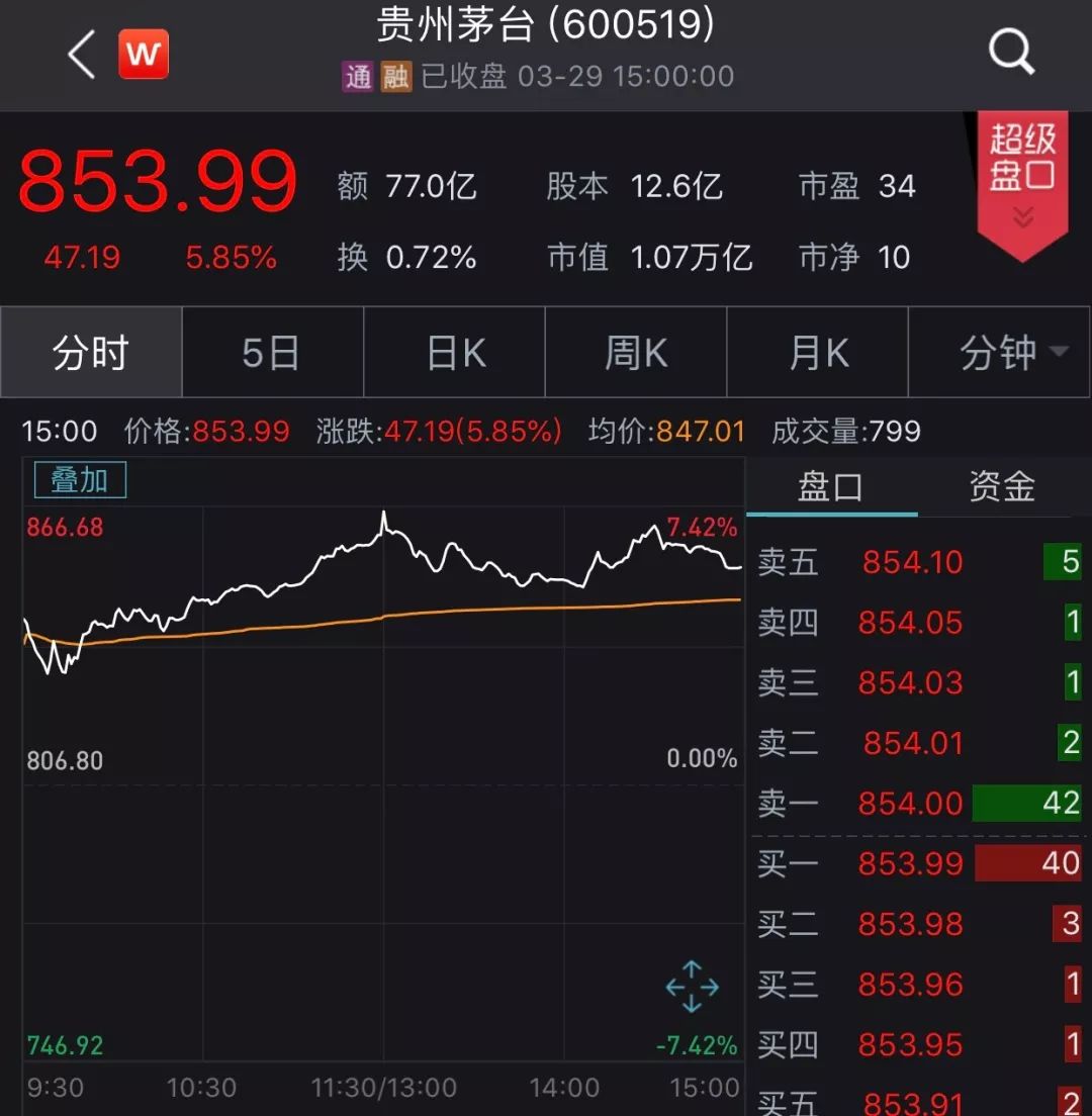 最具代表性的蓝筹大白马贵州茅台近期不断创下历史新高,周五当天涨幅达5.85%,报853.99元。