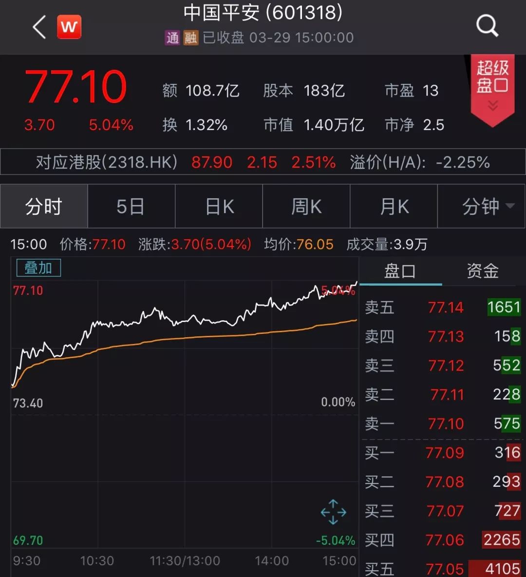 中国平安周五也涨超5%,报77.1元,距离80.23元的新高也不远了。