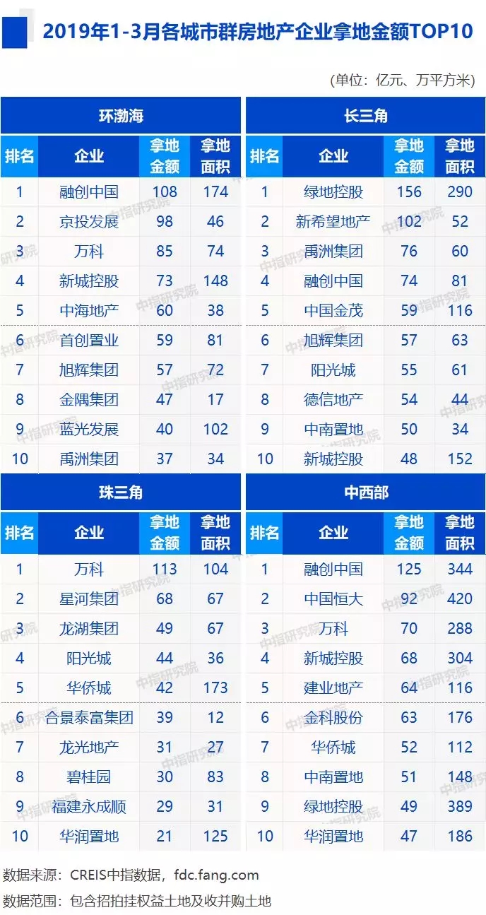 数据显示,2019年1-3月,万科拿地力度不变,以311亿元占拿地榜首位;融创以309亿元拿地金额跃居第二位,上升显著;绿地虽居于第三位,但3月拿地规模降低。
