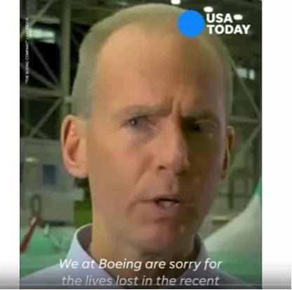 在这段波音公司发布的视频中,其CEO米伦伯格在视频一开头便对此次埃塞俄比亚空难的死难者以及去年印尼狮航空难的死难者表示了明确的“道歉”。