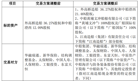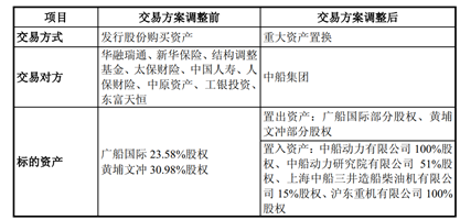 - 待中船集团与中船防务进行完资产置换后,向中船集团、中船防务发行股份购买二者合计持有的广船国际42%股权和黄埔文冲69.02%股权。同时发行股份购买华融瑞通、新华保险等9名交易对方合计持有的广船国际23.58%股权和黄埔文冲30.98%股权。交易完成,广船国际和黄埔文冲将成为中国船舶全资子公司。