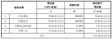新方案中拟置入中船防务的标的资产为沪东重机有限公司100%股权,中船动力有限公司100%股权、中船动力研究院有限公司51% 股权、上海中船三井造船柴油机有限公司15%股权;拟置出资产为中船防务持有的广船国际和黄埔文冲的部分股权。