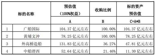 公告显示,由于特定投资者及其对江南造船的增资金额尚未完全确定,因此本次交易涉及江南造船的交易对方及预估对价暂未确定。其他重组标的资产中广船国际100%股权、黄埔文冲100%股权、外高桥造船36.27%股权和中船澄西21.46股权预估值分别为104.34亿元、78.75亿元、47.81亿元和11.3亿元。