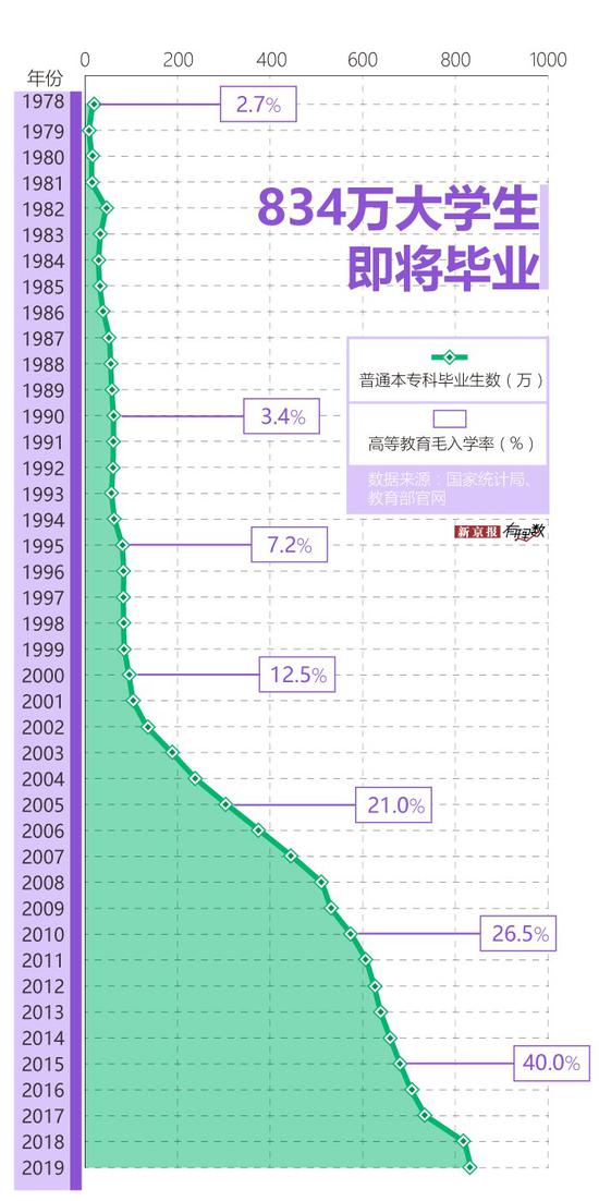 据媒体报道,今年全国普通高校毕业生预计将达到 834 万人,同比增加 14 万人,是 10 年前的 1.6 倍,20 年前的 9.8 倍 。