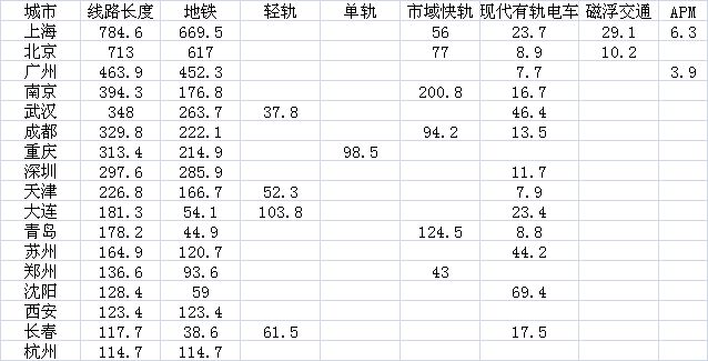 表1:17个城轨里程超100公里的城市(单位:公里)