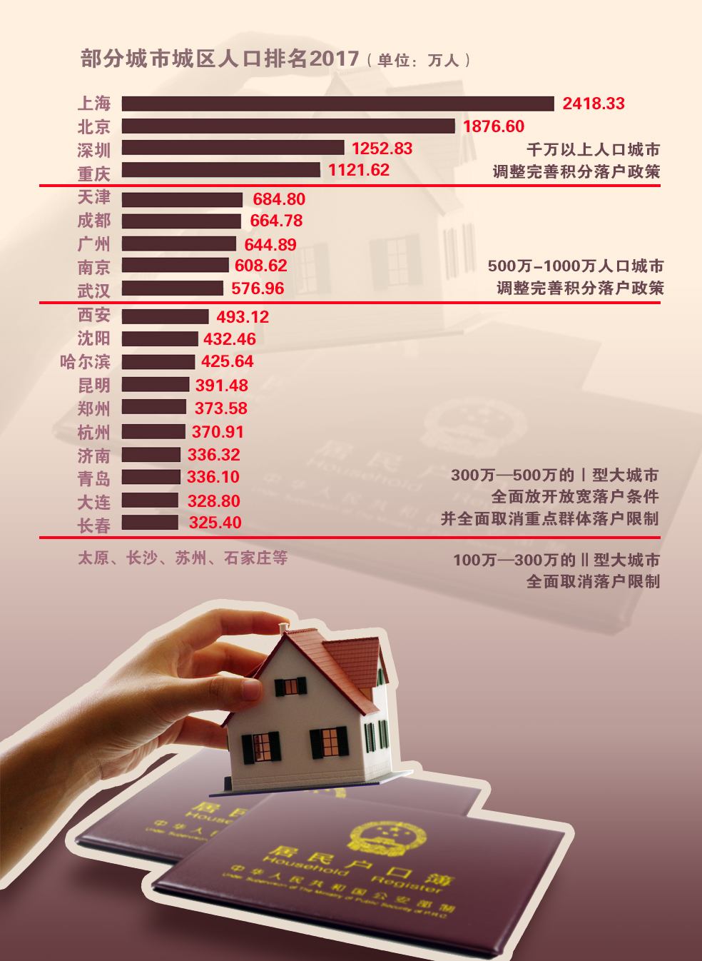 对此,《任务》提出要继续加大户籍制度改革力度,在此前城区常住人口100万以下的中小城市和小城镇已陆续取消落户限制的基础上,城区常住人口100万至300万的Ⅱ型大城市要全面取消落户限制;城区常住人口300万至500万的Ⅰ型大城市要全面放开放宽落户条件,并全面取消重点群体落户限制;超大特大城市要调整完善积分落户政策,大幅增加落户规模、精简积分项目,确保社保缴纳年限和居住年限分数占主要比例。