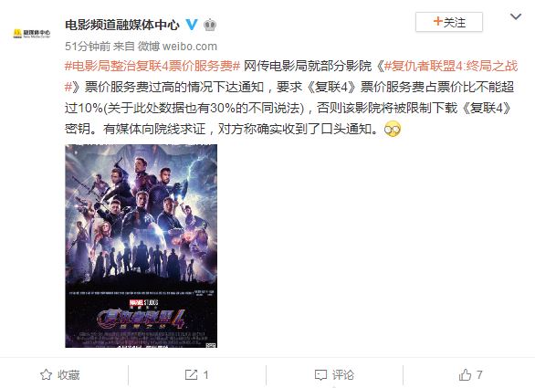 据微博@电影频道融媒体中心 4月18日消息,网传电影局就部分影院《#复仇者联盟4:终局之战#》票价服务费过高的情况下达通知,要求《复联4》票价服务费占票价比不能超过10%(关于此处数据也有30%的不同说法),否则该影院将被限制下载《复联4》密钥。有媒体向院线求证,对方称确实收到了口头通知。