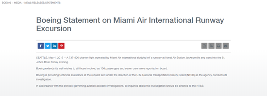 美国国家运输安全委员会(NTSB)表示,该机构正在派遣一支调查小组对事故飞机进行调查。波音公司随后在其官网发布声明称,将提供必要的技术援助协助调查。