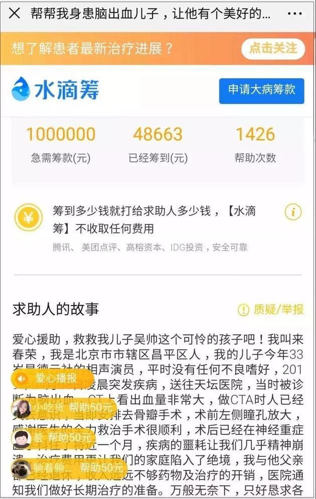 对于网友的质疑,吴鹤臣的妻子@张泓艺昨日发微博回应称:100万是众筹的上限额度,截至5月3日晚已经筹到148184元,筹集费用暂时够用,水滴筹已经关闭。