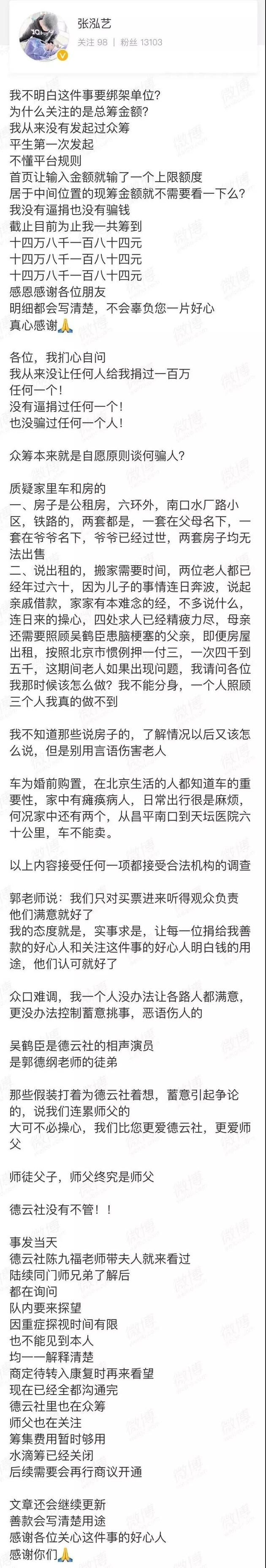 5月4日上午,张泓艺发微博称:再次重申,没有逼捐骗捐,公布一切资产,让好心人了解真实情况,这是我们必须做的。对关注这件事的所有好心人表示衷心感谢,同时也会处理好这件事的正面合理的质疑,感谢各位。