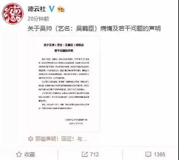 关于吴帅(艺名:吴鹤臣)病情及若干问题的声明