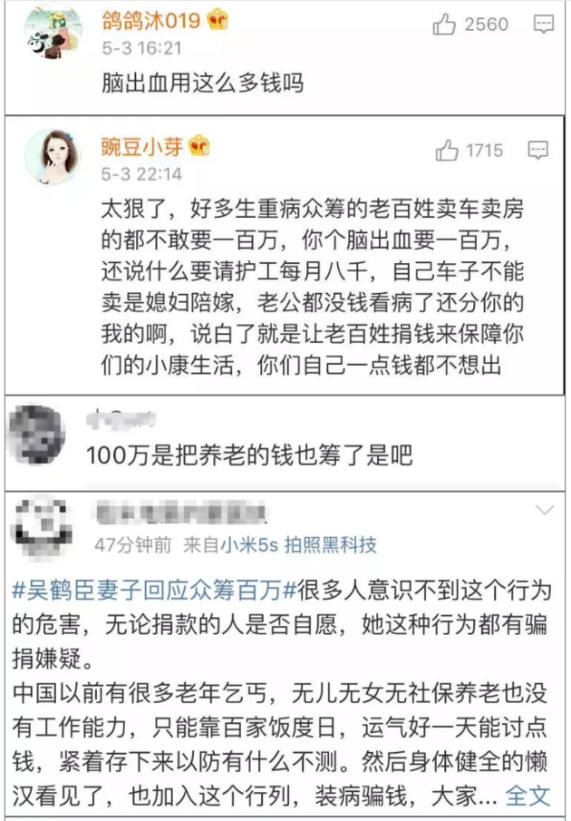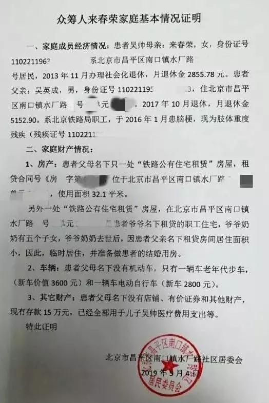 吴鹤臣家里在北京有两套房,有一辆车,也有医保,一个脑出血,自付十几万块就能治好,为什么要众筹100万?