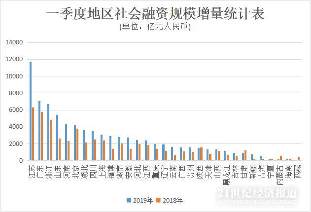 近日,央行公布了2019年一季度地区社融规模增量的统计数据,31个省份(不含港澳台)总计新增社融8.05万亿元,比上年同期多2.63万亿元,增量前三的省份为江苏、广东、浙江,分别增加了1.17万亿、0.71万亿、0.67万亿元,总计占比超三成,增量后三的省份为西藏、海南、内蒙古,分别增29亿、218亿、236亿元,此外,相较于上年同期,甚至有4个省份增量出现下滑,分别是甘肃、西藏、内蒙古、陕西。